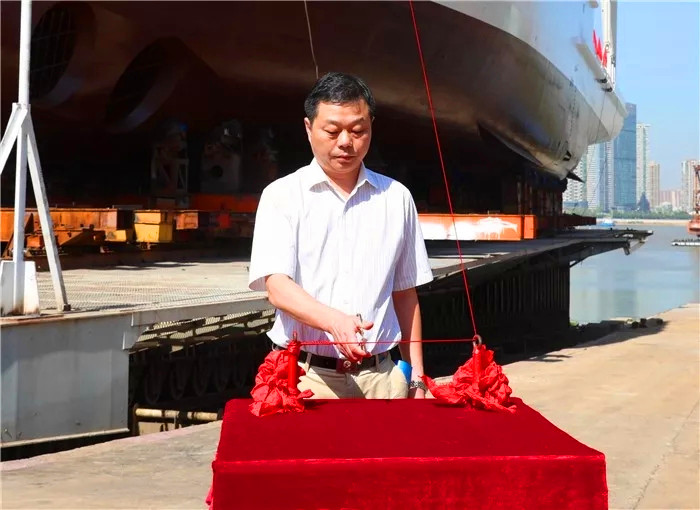 國家自然資源部海洋預(yù)警監(jiān)測司觀測處處長陳陟、國家海洋局東海分局副局長唐文勝、國家海洋局南海分局副局長謝健、國家海洋局北海分局副局長孫利佳、中國船級社武漢分社副總經(jīng)理余德斌、上海佳船工程監(jiān)理發(fā)展有限公司副總經(jīng)理王道順、中船重工第701研究所所長助理楊鐘、武船集團副總經(jīng)理王渭齡為下水剪彩。唐文勝行擲瓶禮。