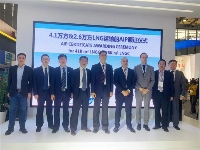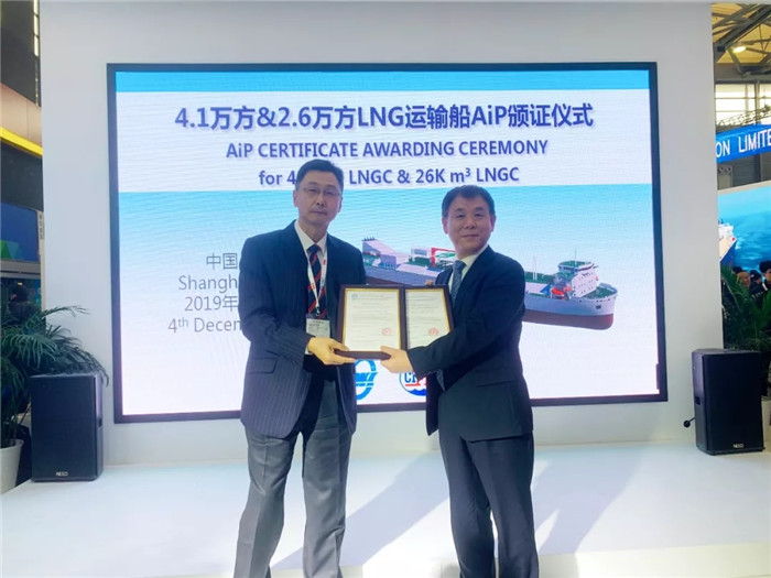 2019年12月4日,在第20屆中國國際海事展上,海工院研發(fā)的26000/41000立方米進(jìn)江薄膜型LNG運(yùn)輸船獲得了中國船級社(CCS)頒發(fā)的AiP認(rèn)可證書。武船集團(tuán)副總經(jīng)理王渭齡代表武船集團(tuán)接收證書,武船集團(tuán)海工院董事長魏建平在頒證儀式上致辭,海工院副院長葉茂做船型介紹。