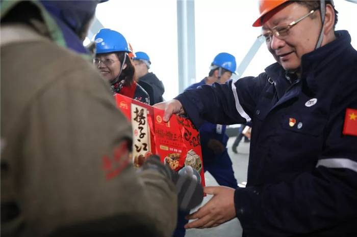 ▲為項(xiàng)目現(xiàn)場(chǎng)施工人送上春節(jié)慰問(wèn)品