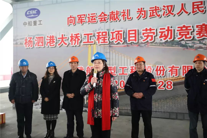 武漢市總工會(huì)黨組書(shū)記、常務(wù)副主席王芳,武船集團(tuán)黨委副書(shū)記、工會(huì)主席楊少稀出席啟動(dòng)儀式,并授予武船楊泗港大橋項(xiàng)目部“勞動(dòng)競(jìng)賽攻堅(jiān)隊(duì)”旗幟。本次活動(dòng)旨在全力推進(jìn)大橋建設(shè)速度,掀起了大干快上熱潮,加快推進(jìn)楊泗港大橋項(xiàng)目建設(shè)。