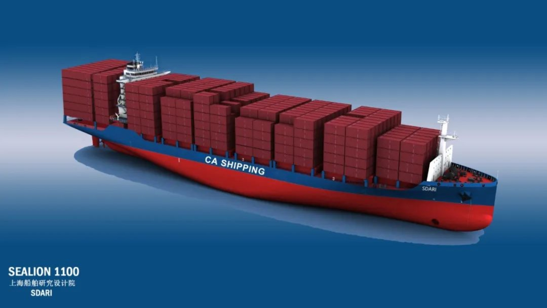 1100TEU集裝箱船系列船舶共計4艘,均由上海船舶研究設計院設計。該系列船型總長147.90米、型寬23.25米、型深11.50米,設計吃水7.30米,設計載重噸9950噸,設計航速18.5節,適用于干柜、冷柜集裝箱的海上運輸。