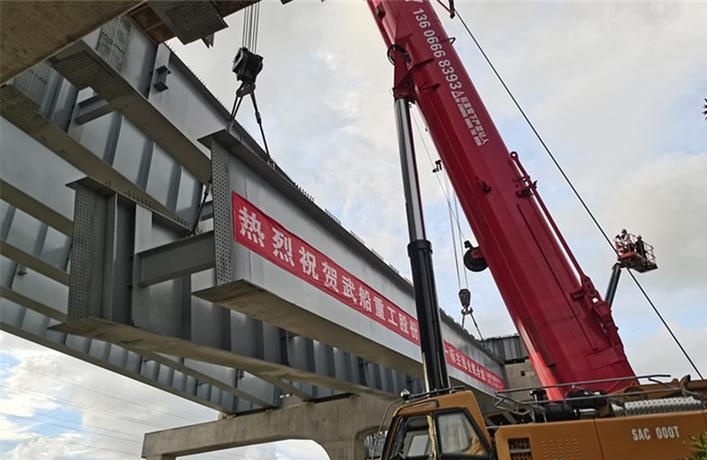 8月16日下午17時許,隨著最后一片鋼板梁成功吊起,在兩臺起重機的默契配合下,穩(wěn)穩(wěn)地落在兩端支座之上,并對孔成功,由中國船舶武船集團武船重工股份承建的臺州路澤太高架TJ01標段鋼板梁全部架設完成。