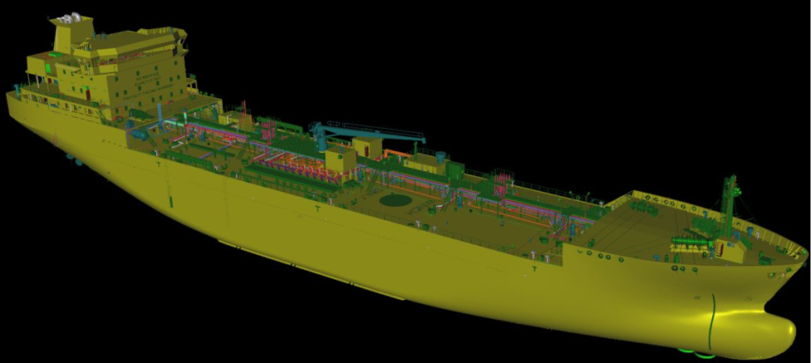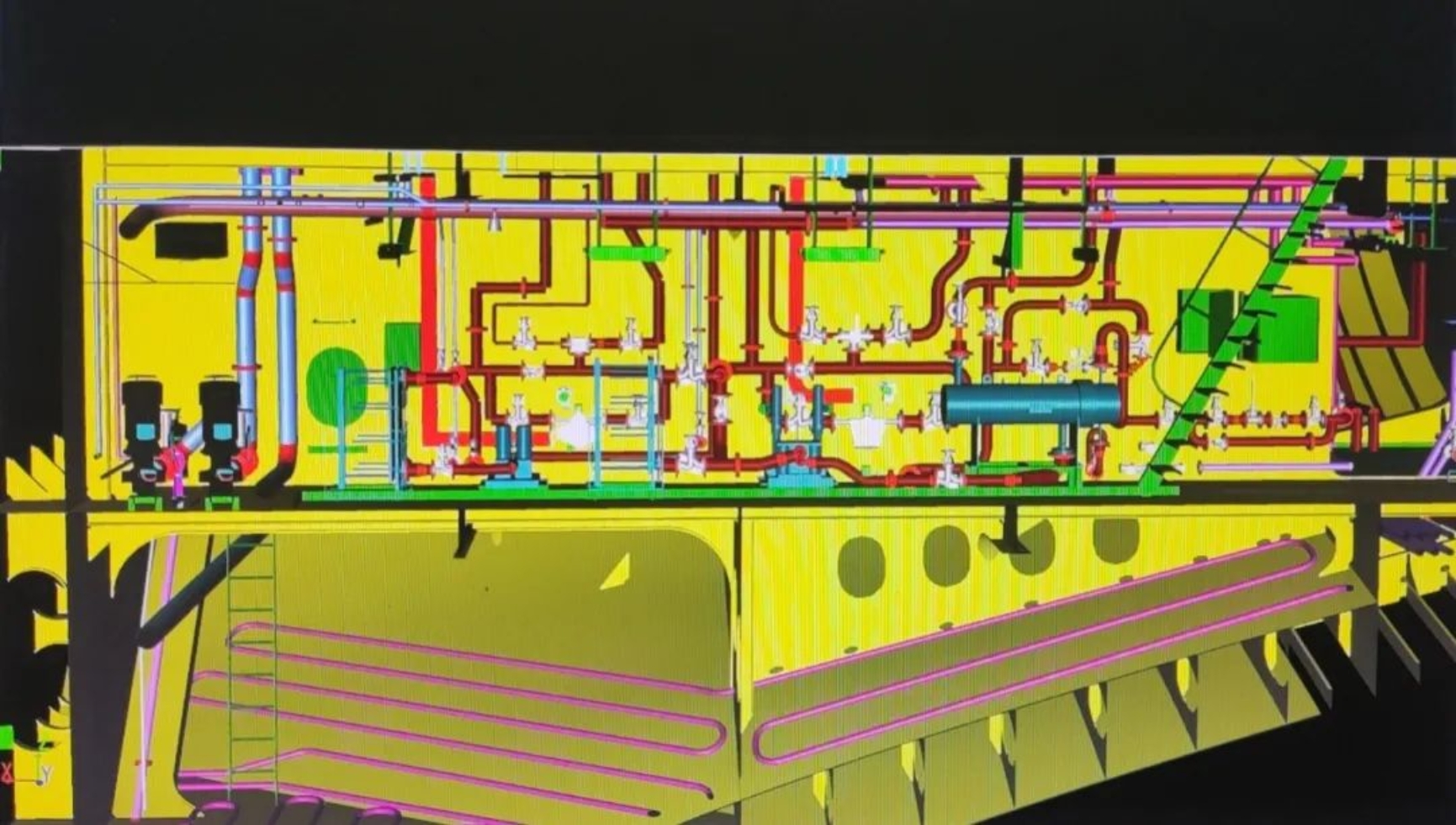 本項目船型是根據(jù)17500DWT化學(xué)品船優(yōu)化而來,在主尺度未變的情況下增加了1000噸的裝載量,壓縮了機艙空間,而且采用了箱冷等設(shè)備,因而對于機艙布置提出較大挑戰(zhàn),前期設(shè)計院18500DWT油化船設(shè)計團隊在與歐德利、設(shè)備廠家等進行多達近1000封郵件溝通,不斷優(yōu)化機艙結(jié)構(gòu),經(jīng)過9次改版,才使此次機艙三維綜合布置工作順利完成。