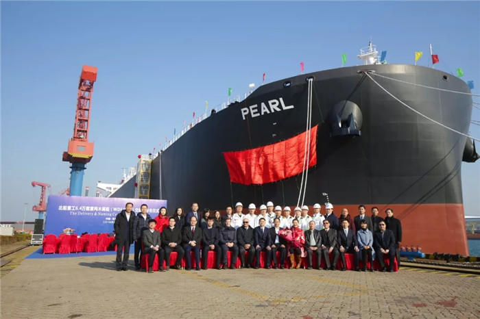 11月29日,武船集團(tuán)北船重工6.4萬(wàn)噸木屑船“PEARL”輪交船暨命名儀式在青島北船重工造船8號(hào)碼頭隆重舉行。