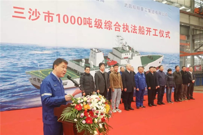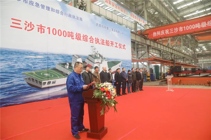 2019年12月2日上午10點(diǎn)08分,三沙市1000噸級(jí)綜合執(zhí)法船開(kāi)工儀式在武船集團(tuán)雙柳基地順利舉行。