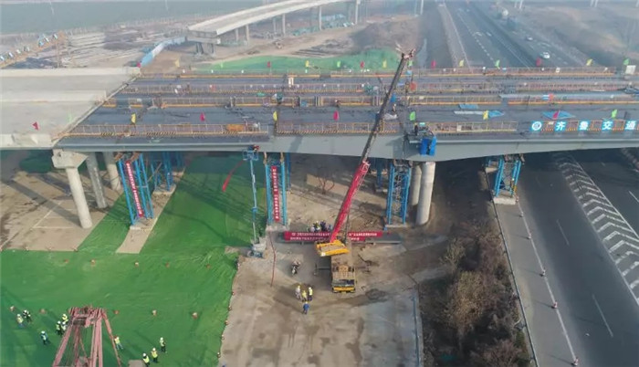 董梁高速寧梁段鋼箱梁工程位于泰安市東平縣內一樞紐點,4次橫跨交濟廣高速、濟徐高速。項目共包括4聯鋼箱梁,其中主線橋兩幅各155米,B匝道155米,H匝道150米,C匝道60米,共計212片鋼箱梁,全部在武船北方基地制造完成,再運輸到橋址進行安裝。由于跨高速公路臨時支架不便搭設,且鋼箱梁節段需多點多次吊裝,為工程帶來了一定的難度,武船重工股份多次優化工藝方案,反復與總包單位協商安裝方法,做好各項準備工作,確保工程順利進行。